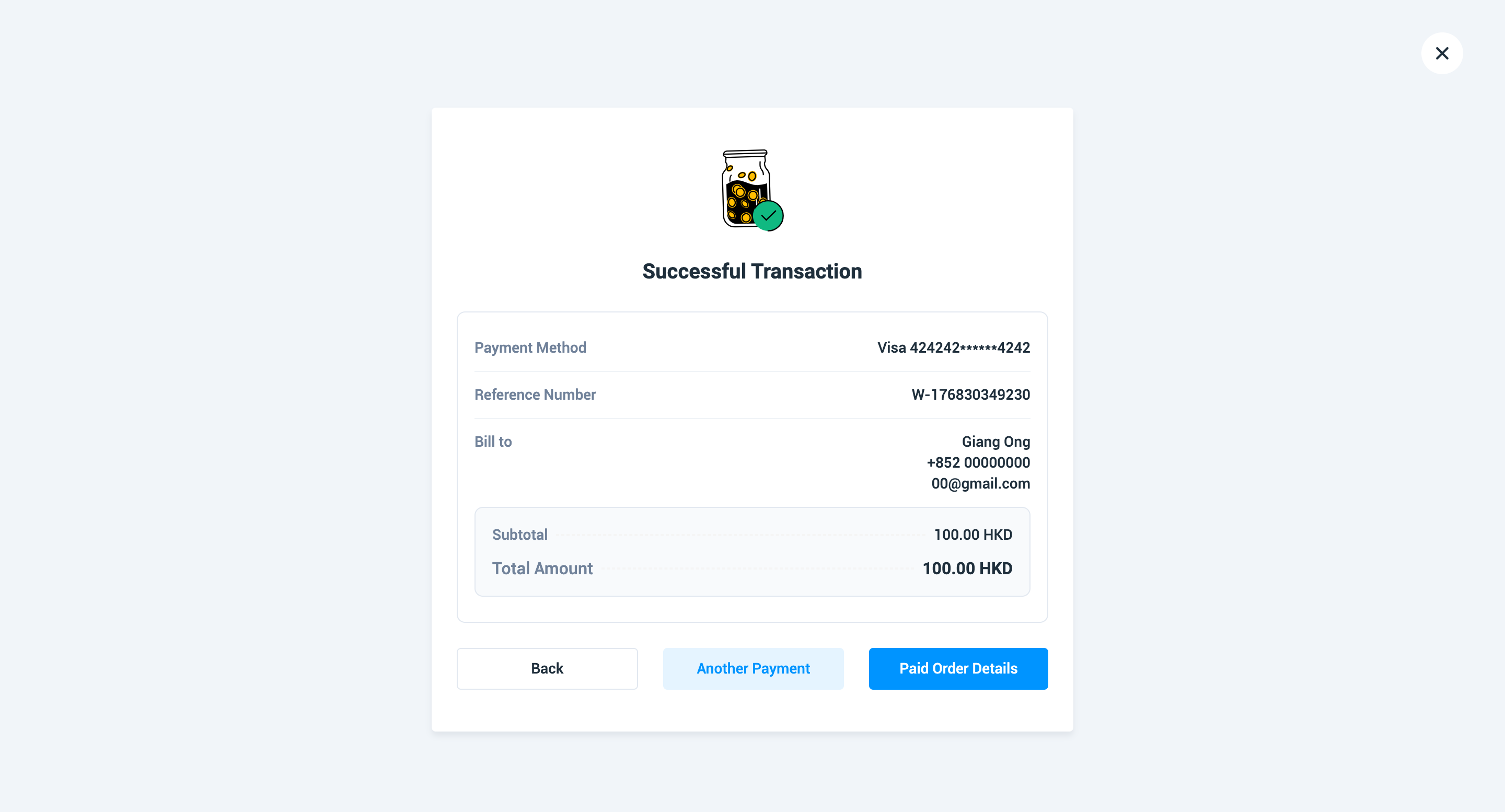 6- 您可點擊「再次付款」進行另一筆付款,或返回查看已完成交易的詳細資訊。